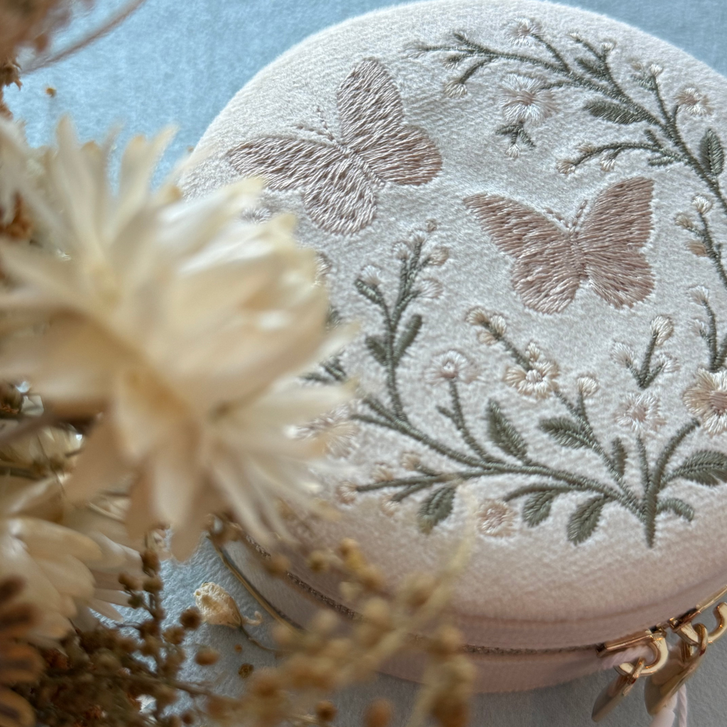 Embroidered with quiet florals and fluttering wings, these travel jewelry boxes are a gentle place to keep the pieces that carry your stories—tucked safely beside you, wherever you wander.